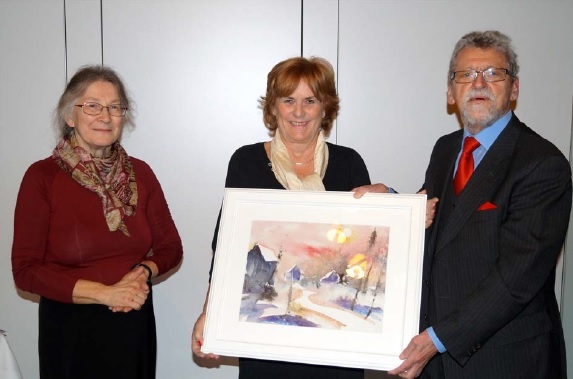 Eva König-Hollerwöger (Tochter des Künstlers Ernst Wickenhauser, links), die glückliche Gewinnerin Christine Marehard aus Vöcklabruck und KIWANIS-Präsident Dr. Konrad Meingast bei der Preisübergabe.